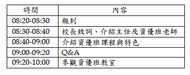 邀請家長撥冗參加本校於112 年5 月12 日(星期五)8:20-10:00辦理之「資優班新生家長說明會」(地點:興隆國小校史室),以增進對資優班課程運作及學生相關權益之瞭解。以下