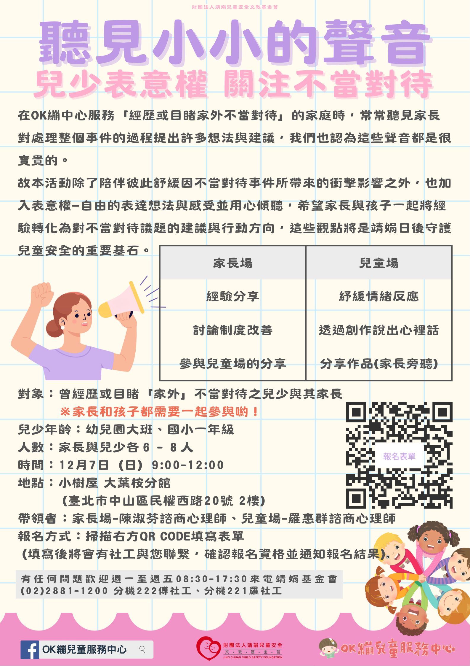 有關財團法人靖娟兒童安全文教基金會OK繃兒童服務中心 辦理114年度「聽見小小的聲音」不當對待議題討論