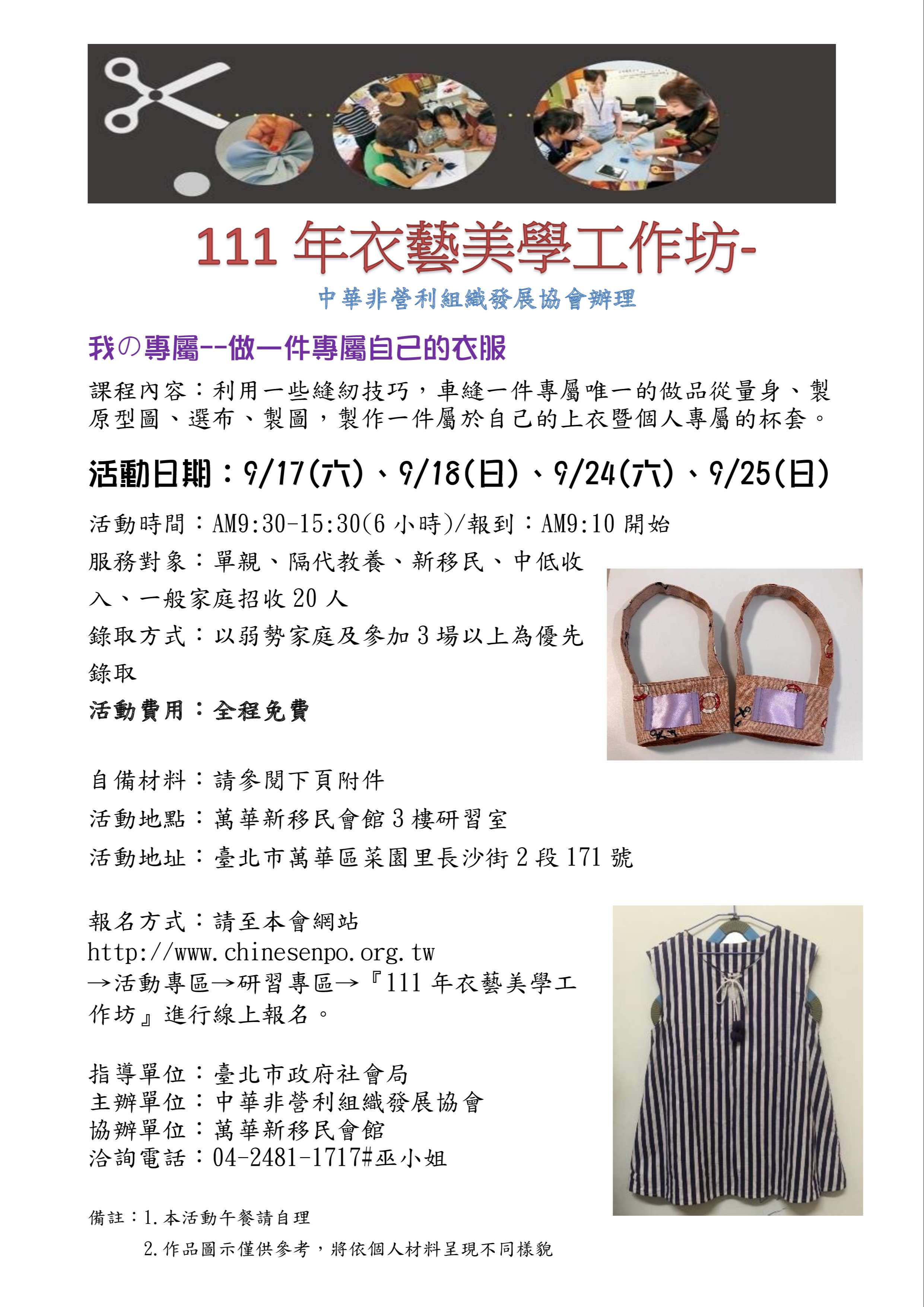 四、報名方式:請至中華非營利組織發展協會→活動專區→研習專區→『111年度衣藝美學工作坊』進行報名,謝謝!