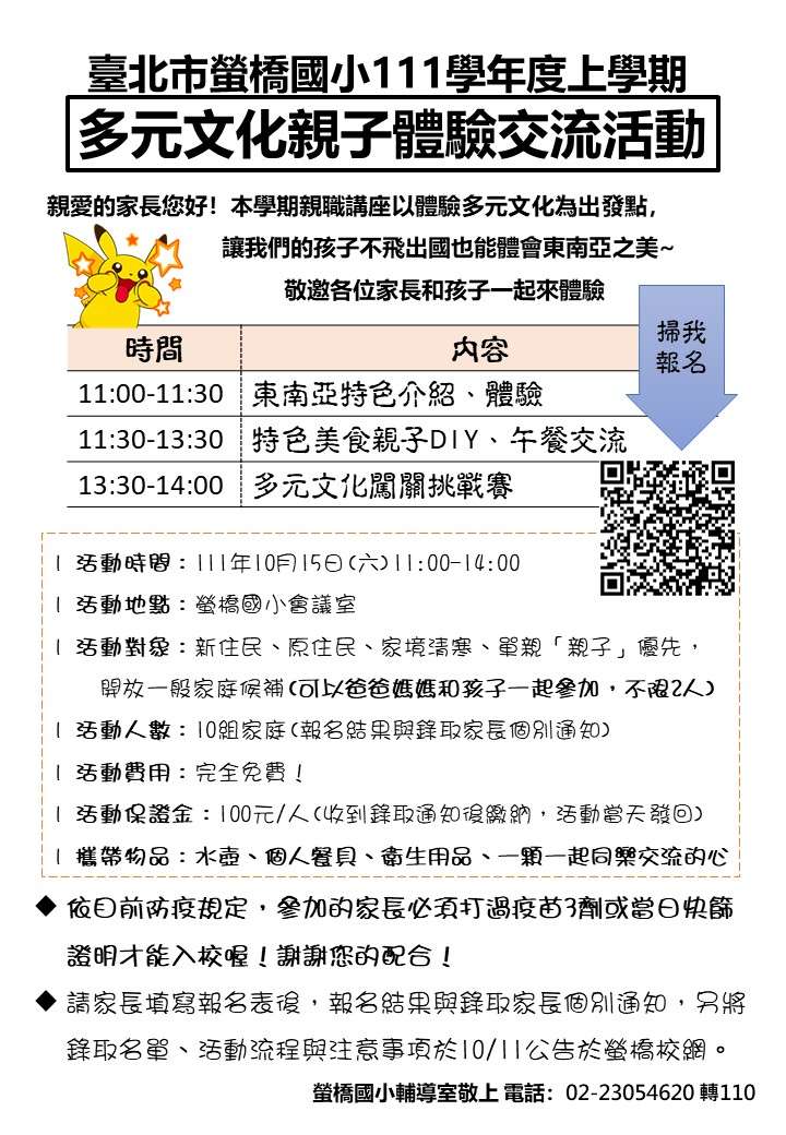 一、螢橋國小辦理多元文化親子體驗交流活動,活動免費採線上報名。