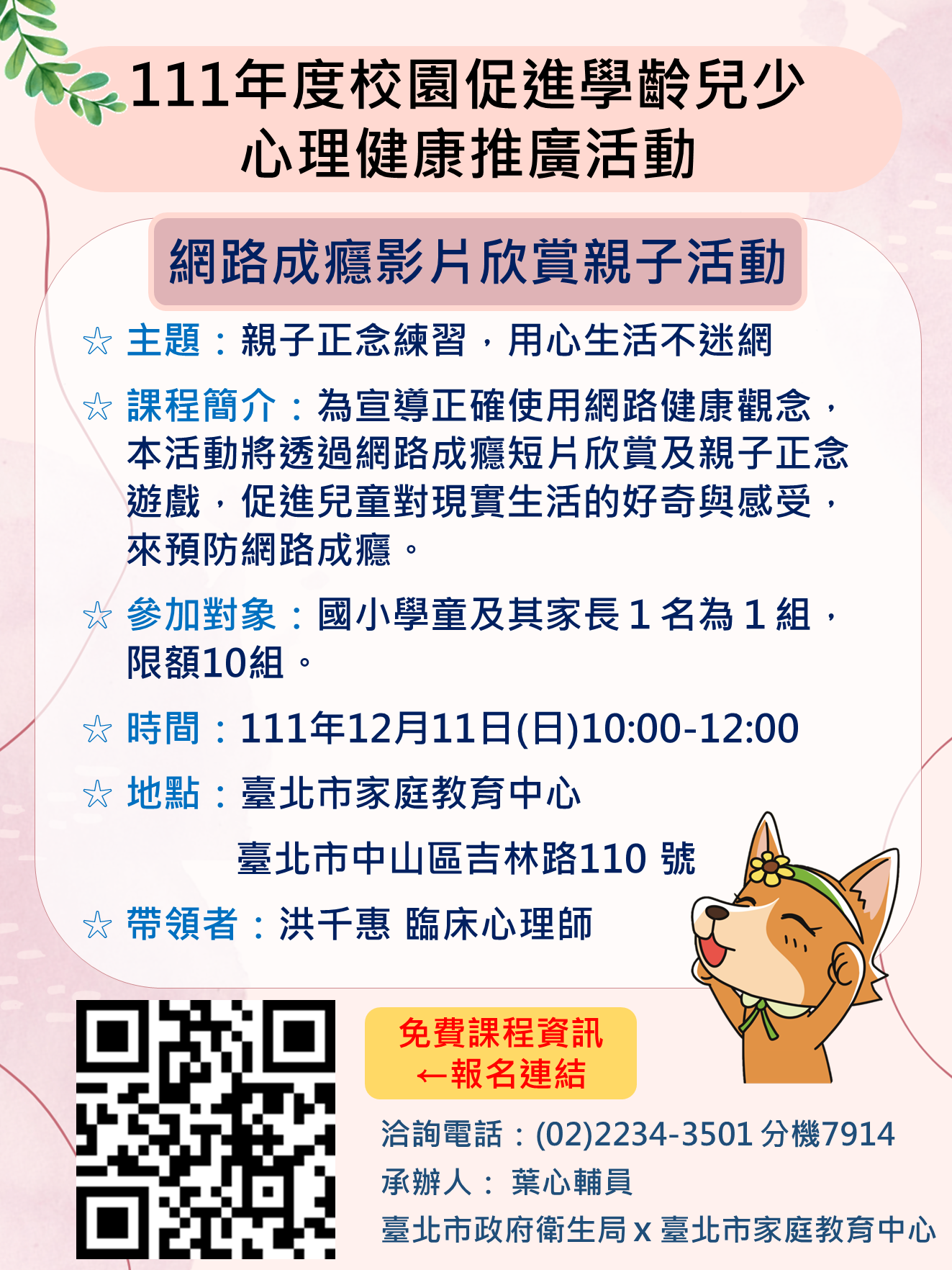 (五)報名網址:https://mental-health.gov.taipei/(臺北市社區心理中心官網-報名專區-講座/活動)。