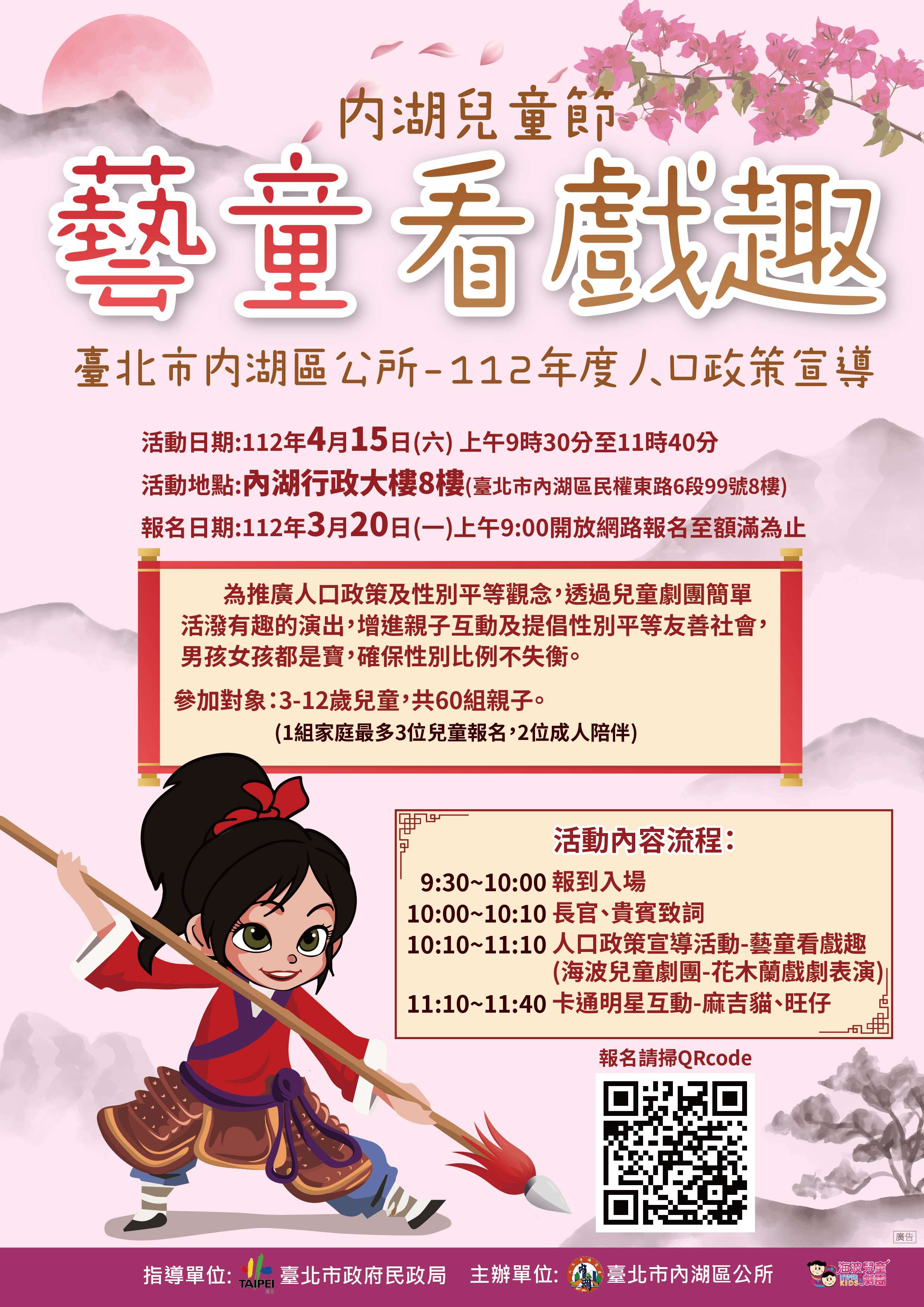 臺北市內湖區公所112年度人口政策宣導「內湖兒童節-藝童看戲趣」,為推廣人口政策及性別平等觀念,特別邀請海波兒童劇團演出精采經典大戲「花木蘭」,於4月15日(星期六),臺北市內湖區行政中心8樓大禮堂(臺北市內湖區民權東路6段99號8樓)舉辦,3月20日開放網路報名60組親子家庭,額滿為止,每組家庭贈送1份宣導禮,現場有卡通明星互動、古早童玩區讓小朋友好看好玩又有得拿。(本次活動為線上網路報名),詳情請參閱內湖區公所網站-最新消息。