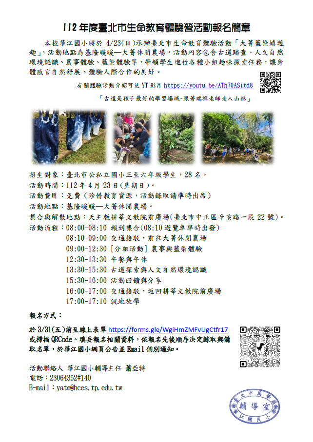 七、報名方式:於3/31(五)前,填寫線上表單https://forms. gle/WgiHmZMFvUgCtfr17,依報名先後順序決定錄取與備取 名單,於華江國小網頁公告並Email個別通知。