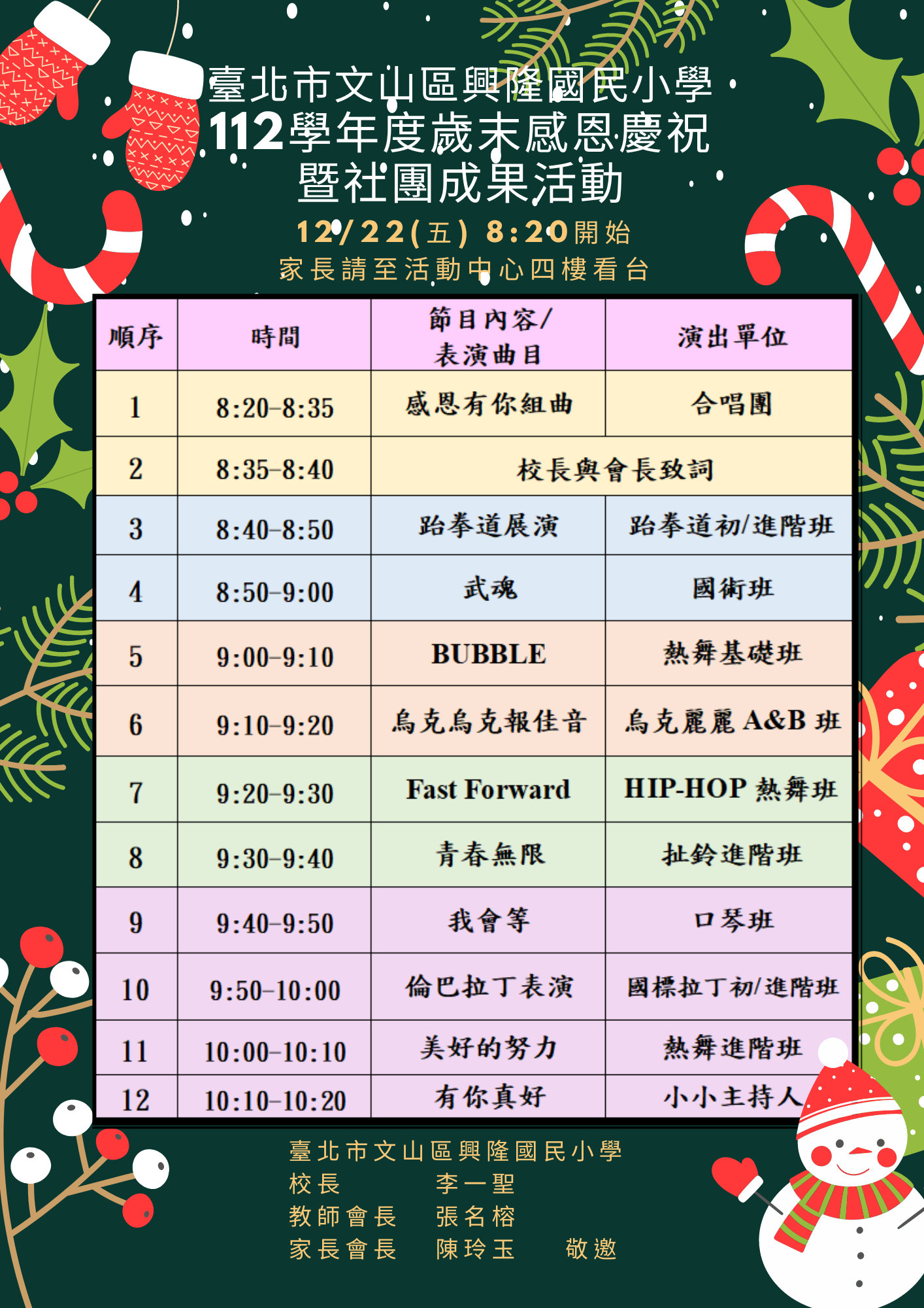 臺北市文山區興隆國民小學 112學年度歲末感恩慶祝活動暨社團成果發表系列活動
