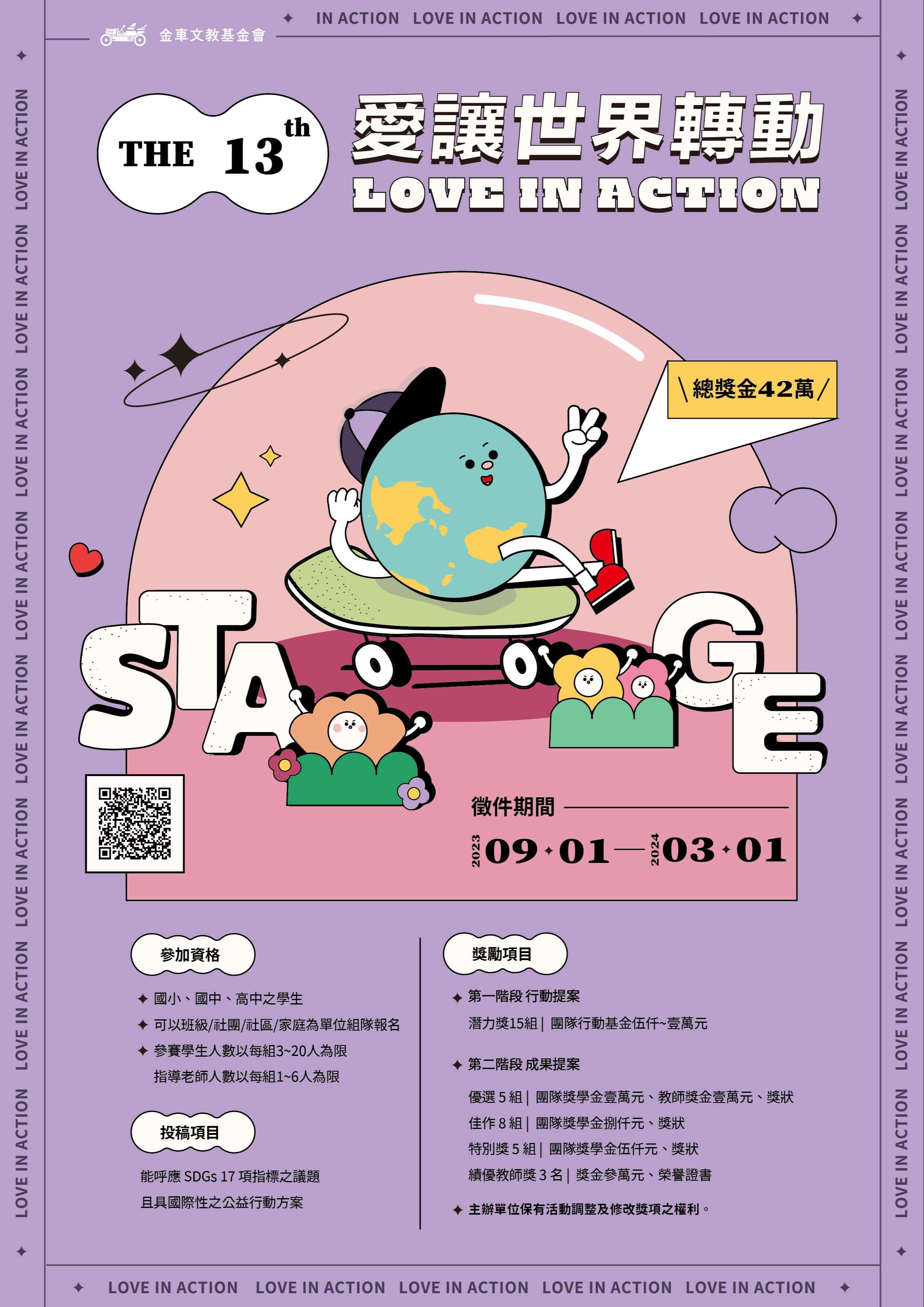 一、財團法人金車文教基金會自2011年開始舉辦「愛讓世界轉動 兒少公益行動」徵選,以STAGE行動步驟為基礎,從發現問題、創意思考、行動實踐到收穫反思,鼓勵青年學子以國際視野落實在地行動,培育下個世代成為具備同理心、行動力及團隊溝通力