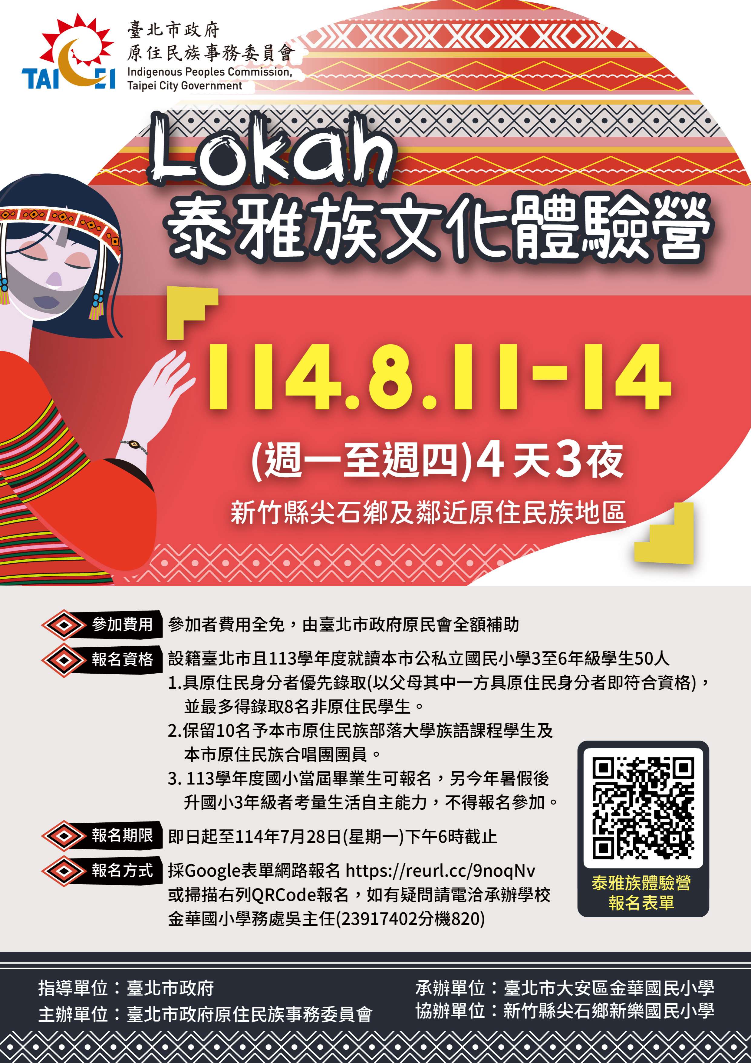 主旨:臺北市政府原住民族事務委員會辦理「Lokah泰雅族文化體驗營」,報名簡章及宣傳海報如附件。