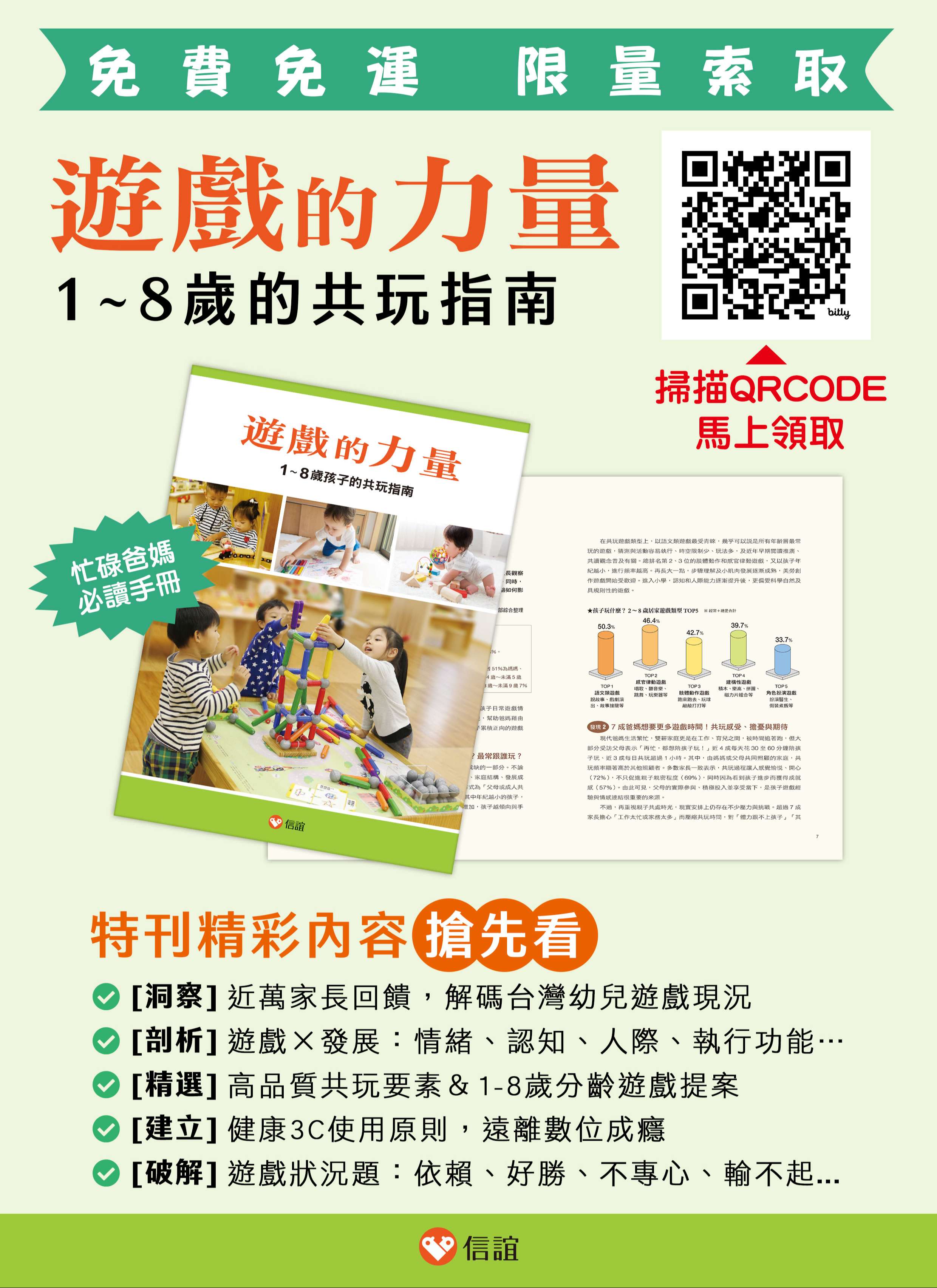 一、信誼基金會為關心國內幼兒遊戲行為與發展,透過網路調查邀請家長分享觀察,共收集9,981份有效數據,進一步分析歸納2-8歲居家遊戲、友伴互動及3C使用等現況,並邀請腦科學、心理學與幼教等專家解讀遊戲背後的發展密碼,編纂《遊戲的力量:1-8歲孩子的共玩指南》特刊,深入探討遊戲經驗對各階段成長的重要性,亦提供分齡引導策略與常見問題解決方案。