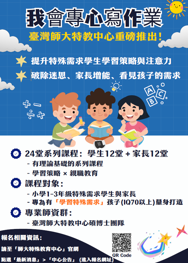 (一)招生對象:國小一年級至三年級,具學習特殊需求(IQ 70 以上)之學生及其家長。