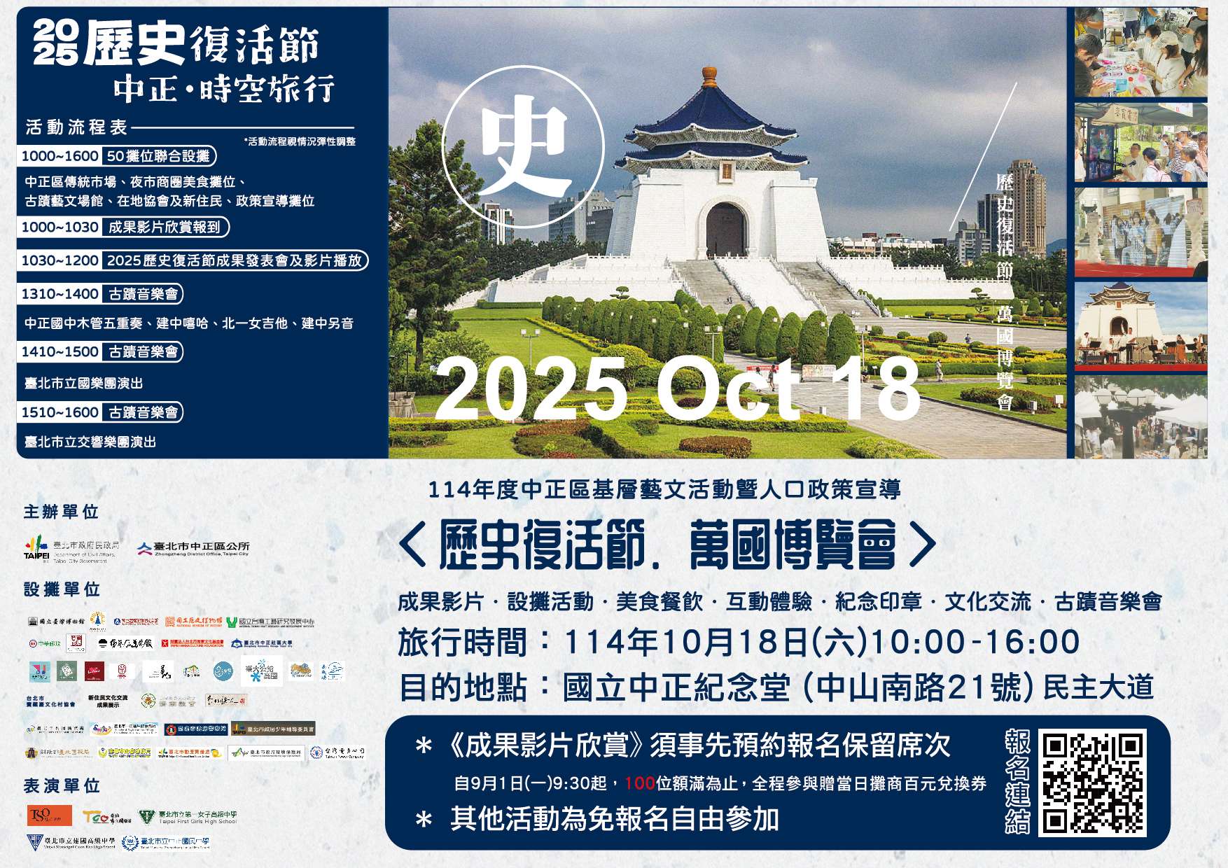 臺北市中正區公所將在114年10月18日(星期六) 上午10時至下午4時於中正紀念堂前民主大道(中山南路 21號),舉辦「2025歷史復活節.萬國博覽會」,展演 歷史復活節活動成果,特邀區內票選優勝的傳統市場、 夜市商圈美食攤位、各活動合作機關、在地協會及商 圈、博物館、古蹟場館等,一起設置50個活動攤位,下 午特邀在地音樂社團、市立國樂團及交響樂團,舉辦古 蹟音樂會,邀請您一同品文化、玩體驗、拾回憶,感受 獨特的中正區地方特色!更多活動詳情,請上「歷史復活節-臺北市中正區公所」FB粉絲團(https://www. facebook.com/papagozhongzheng),或上臺北市中正區公所網站基層藝文專區(https://reurl.cc/OmyAD7)查 詢。