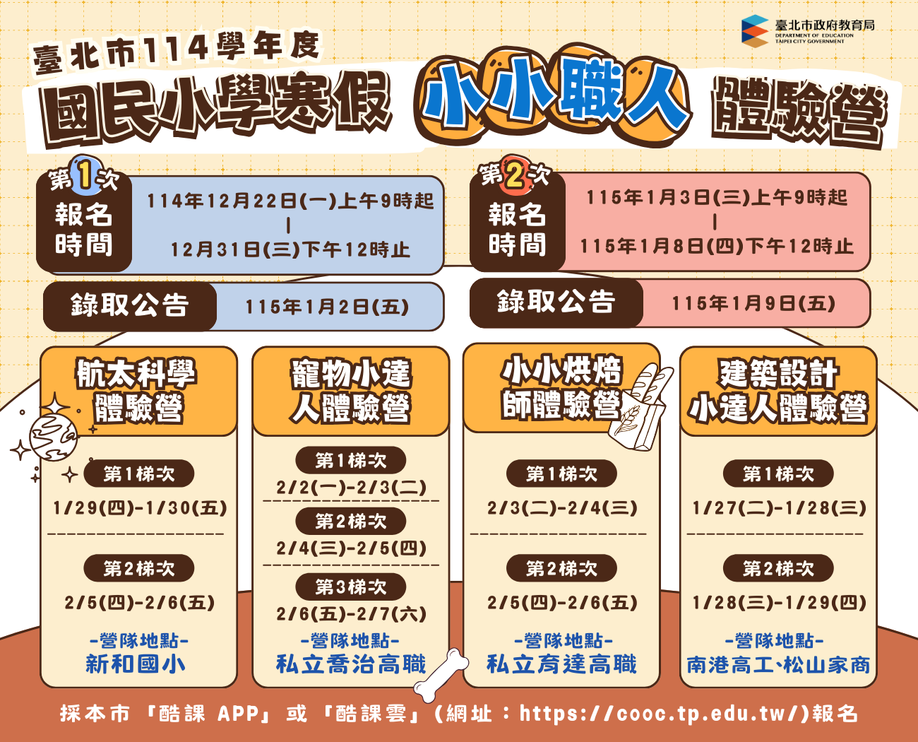 2、第二次線上報名:若有營隊未達招生人數,則開放第二次線上報名,採先搶先贏制,報名時間自115年1月3 日(星期三)上午9時起至115年1月8日(星期四)中 午12時止,115年1月9日(星期五)公告錄取名單,由系統推播發送個人錄取情形。